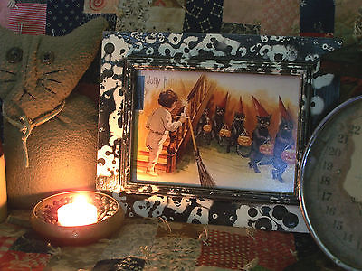5 BLACK CATS/RED HATS/BROOM-VtG HaLLowEeN-Primitive/Folk Art Framed Tuck Print