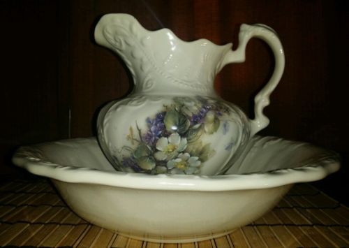 Title (ebay affiliate link): GORGEOUS PORCELAIN PITCHER AND BOWL SET WHITE MOFIT PRESSED PURPLE FLORAL EUC