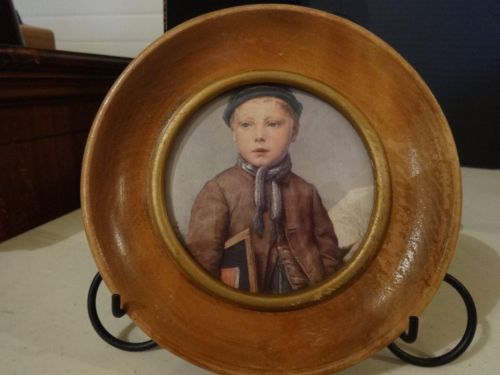 Antique Print of Schoolboy in Round Wood Frame with Glass