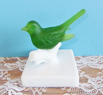 Title (ebay affiliate link): Westmoreland Lime Green Satin Glass Bird on Milk Glass Branch Base