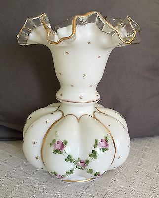 Large Vintage Fenton Milk Glass Silver Crest Melon Vase w/ Charleton Decoration