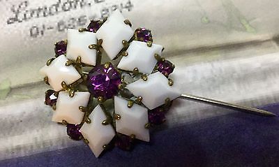 VINTAGE OLD SUFFREGETTE BROOCH CHARMING VIOLET CRYSTAL MILK GLASS WHITE DIAMOND