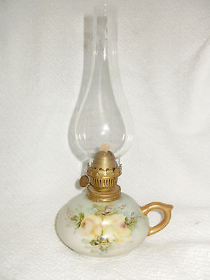 ANTIQUE OIL LAMP, HAND PAINTED PORCELAIN, YELLOW ROSES