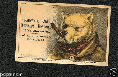 Title (ebay affiliate link): Currier & Ives Trade Card of Dog Smoking a Cigar by H. Paul Dining Rooms Boston