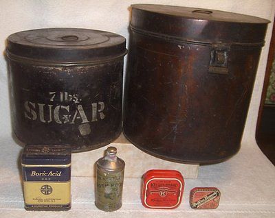 Title (ebay affiliate link): 6 ANTIQUE/VINTAGE LARGE & SMALL TINS/FLOUR/SUGAR/TYPEWRITER RIBBONS/ETC.