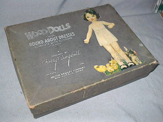 Title (ebay affiliate link): ANTIQUE "WOOD DOLLS"w/"ROUND ABOUT DRESSES"by MILT.BRAD