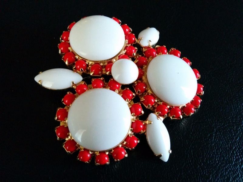 Title (ebay affiliate link): Vintage Brooch Pin Mid Century Milk Glass Rhinestone Flower Juliana Gold Tn! 384