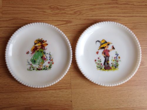 Rare Vintage Gottschlich Milk Glass Plate Set, GIRL And BOY, Beaded Edge, EUC