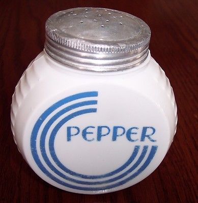 Title (ebay affiliate link): HOCKINGHOCKING VITROCK BLUE CIRCLE RANGS PEPPER SHAKER DEPRESSION ERA MILK GLASS