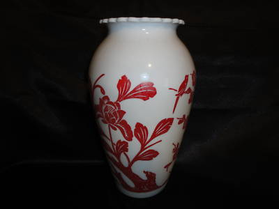 Vintage Milk Glass Vase With Red Floral & Birds