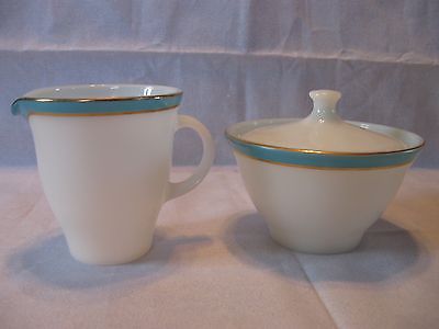 Title (ebay affiliate link): 1960's PYREX~Creamer/Sugar Bowl w/ Lid~Turquoise Stripe/Gold Trim~VERY NICE!