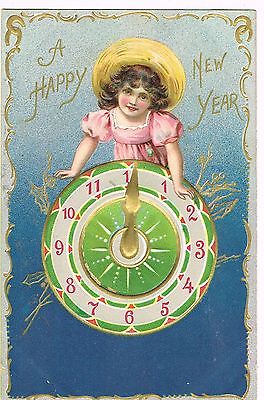 ANTIQUE EMBOSSED HAPPY NEW YEAR Postcard (RAPHAEL TUCK) YOUNG GIRL, CLOCK