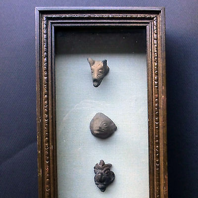 Three Pre Columbian Head Fragments Artifacts Displayed in Shadow Box