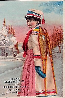 Victorian trade card; New York GLOBE paint oil; lady with skis -- beautiful!