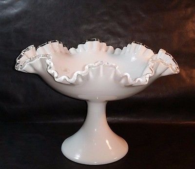 Title (ebay affiliate link): Fenton Milk Glass Silver Crest Ruffled Large Pedestal Fruit Bowl Basket