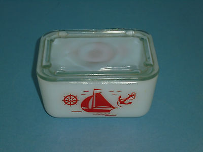 Title (ebay affiliate link): VINTAGE McKEE MILK GLASS REFRIGERATOR DISH RED SHIP SAILBOAT PATTERN w/LID