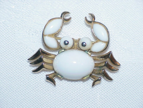Title (ebay affiliate link): Vintage signed CROWN TRIFARI Goldtone w MILK GLASS STONES CRAB PIN PAT. PEND.
