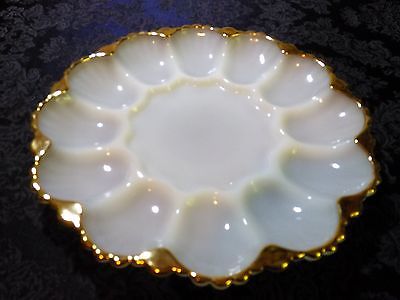 Vintage Anchor Hocking Egg Oyster Plate Server White Milk Glass & Gold Trim