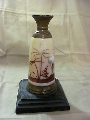 ANTIQUE BIRD CRANE EGRET DECORATED MILK GLASS BRASS & CAST IRON LAMP BASE