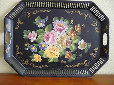 ANTIQUE VERY LARGE BLACK TOLEWARE TRAY WITH HAND PAINTED CABBAGE ROSES