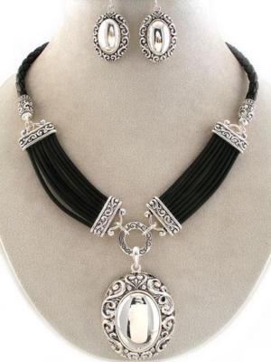 WESTERN LAYERED CORD ANTIQUE SILVER DROP NECKLACE SET