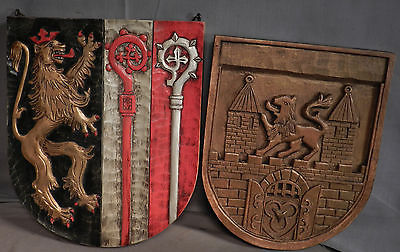 2 Vintage Medieval Gothic hand carved Heraldic Plaque Shield Lion Crosier castle