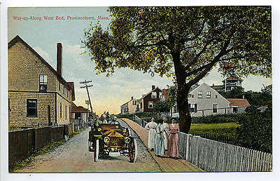 Provincetown MA Mass women walking along road, antique auto, homes, early