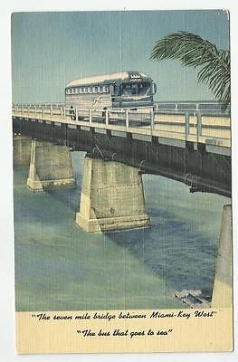 c1930's Greyhound Bus Traveling Miami Key West Bridge FL Florida Linen Postcard