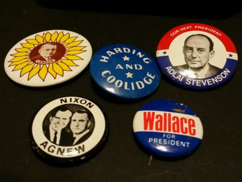 5 Campaign pins, Landon, Nixon/Agnew, Adlai Stevenson, Wallace, Harding/Coolidge