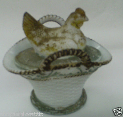 ANTIQUE RARE Covered opaque Milk Glass Hen on Nest Basket Handles 1880's Unusual
