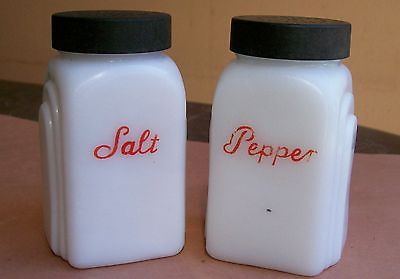 vtg ART DECO MILK GLASS RANGE SET SALT & PEPPER SHAKERS REPLACED LIDS? S&P