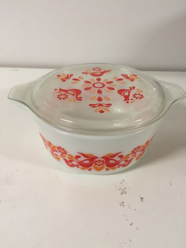 Title (ebay affiliate link): Vintage Pyrex Friendship Red Bird Casserole Bowl 475 Milk Glass 2 1/2 QT W/ Lid
