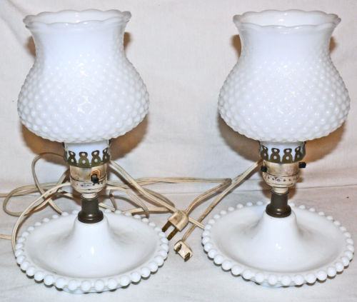 White Milk Glass Hobnail Dresser Table Vintage LAMPS Set of 2