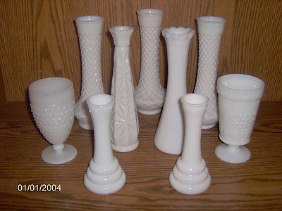 Title (ebay affiliate link): Lot 9 Vintage White Milk Glass Pieces - Vases - Wedding Country Chic
