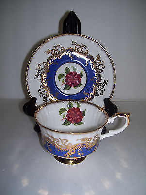 PARAGON BY APPOINTMENT RED FLOWERS BLUE & GOLD Tea Cup & Saucer ANCESTRAL ROSE
