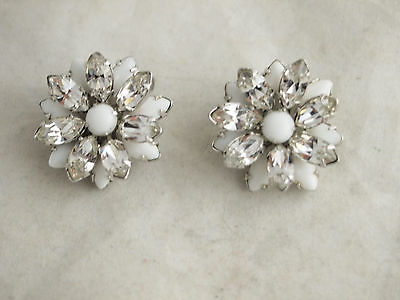 Vintage WEISS Style Milk Glass Crystal Rhinestone Flower Rhodium Clip Earrings
