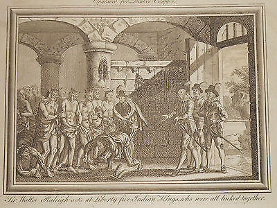 1768 ENGRAVING SIR WALTER RALEIGH EXPLORATION AMERICA INDIAN KINGS WERE SET FREE