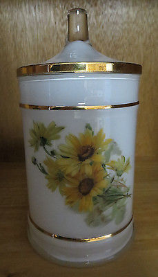 Title (ebay affiliate link): Vintage White Frosted Glass Apothecary Vanity Jar & Lid w/Yellow Daisy Flowers