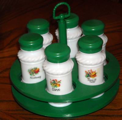 Vtg. Spice Rack Milk Glass Jars 50s Kitchen Utensils