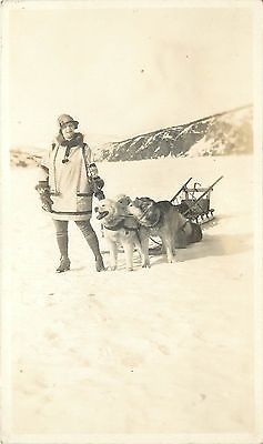 1920s Real Photo PC Stylish Woman w Anorak Cloche Hat Husky Dogs Hitched to Sled