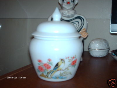 Milk Glass Temple Lidded Jar w/ Song Bird & Roses! Avon