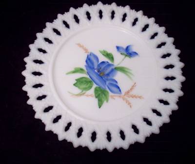 ANTIQUE HAND PAINTED MILK GLASS PLATE BLUE BLOSSOM