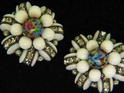 VINTAGE WHITE MILK GLASS RHINESTONE EARRINGS JONNE'