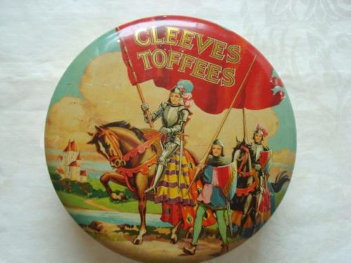 Title (ebay affiliate link): Vintage Cleeves Toffee Tin ~ Knights ~ Horses ~ Castle ~ 6 Inches ~ England