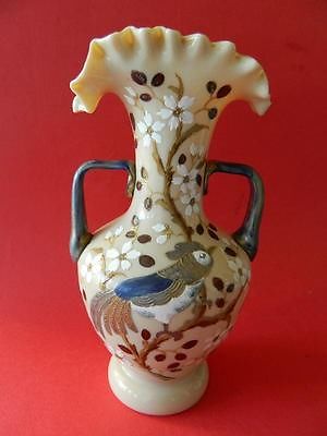 c1890s Raised Gilt & Enamelled Glass Vase Ruffled Rim Bird &Flowers Bohemian