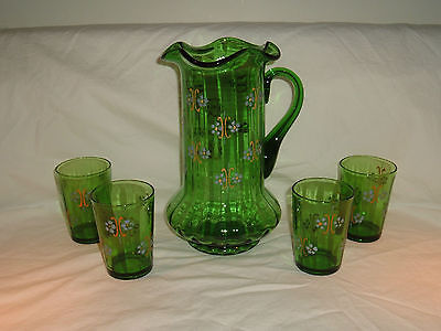Antique Victorian Enameled Green Glass Water Lemonade Set 4 Tumblers Glasses
