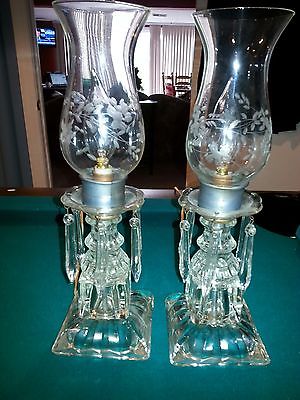 ANTIQUE Pair Crystal Mantle Lamps Hurricane Boudoir