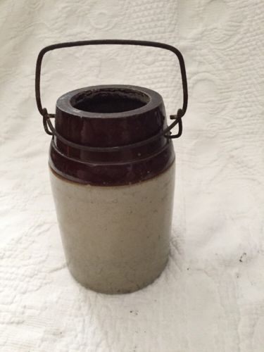 Brown And White Glaze Stoneware Crock With Wire Handle