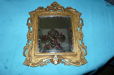 Vintage Ornate Goldtone Cast Iron Wall Hanging Beveled Mirror