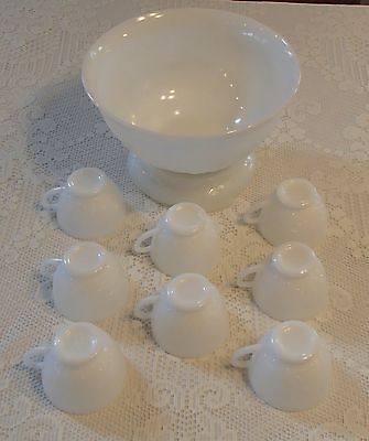 Vtg Milk Glass Punch Bowl with Pedestal Stand and 8 Cups - Very Nice!